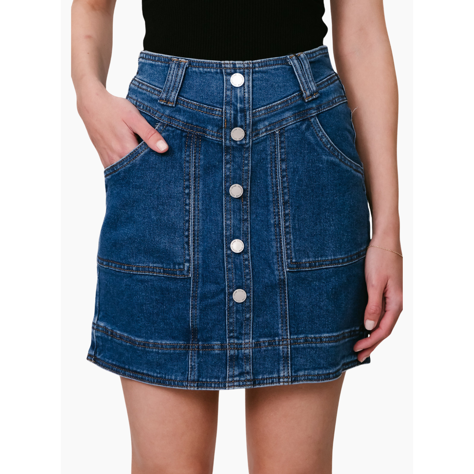 Add a timeless classic to your wardrobe with this high-waisted button-front denim skirt. Made from durable, soft denim in a rich indigo wash, this skirt features bold contrast stitching and a flattering A-line silhouette. The vertical seam detailing elongates the figure, while the full front button closure adds vintage charm and easy wearability. Front pockets provide both style and function, making this skirt as practical as it is stylish.